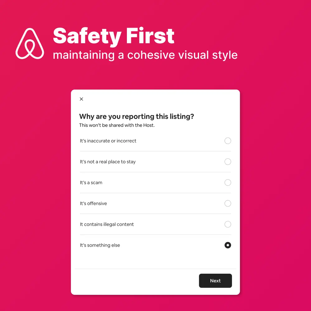 🛡️ Safety First: Airbnb maintains a cohesive visual style even in essential but potentially sensitive areas like reporting, ensuring users feel safe and empowered to voice concerns.