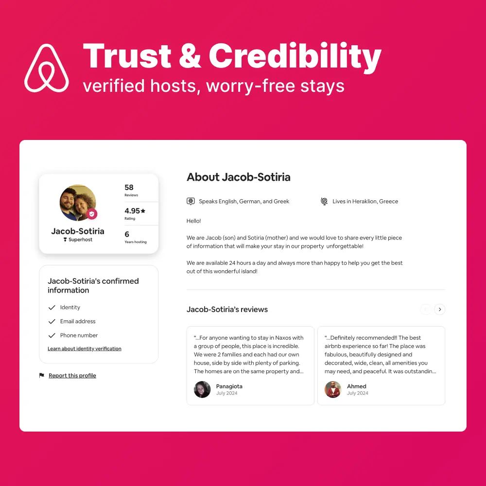 ✅ Trust & Credibility: Verified hosts, worry-free stays. Airbnb prioritizes safety and security, building confidence through verified profiles and highlighting Superhost achievements.