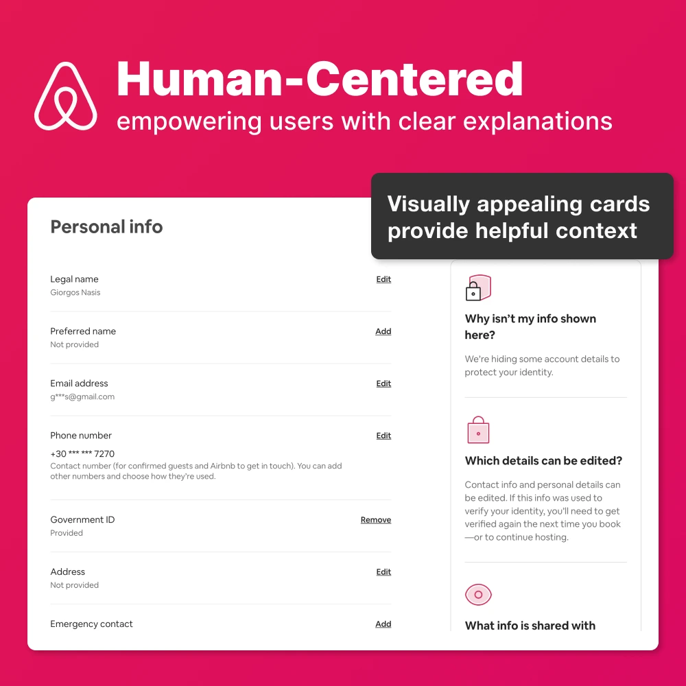 👤 Human-Centered Approach: Empowering users with clear explanations. Airbnb excels at making complex information simple with visually appealing cards that provide context and guidance within account settings.