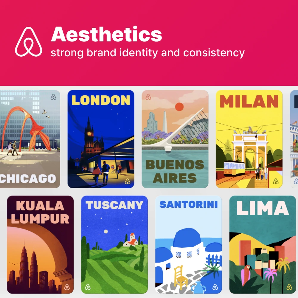 🎨 Aesthetics: Strong brand identity and consistency. Airbnb's signature illustrations evoke a sense of wanderlust and adventure, reinforcing their brand identity and inspiring exploration.